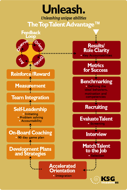 nleash. Talent begets talent! Top performers are attracted to each other and to cultures that provide the opportunity to express their unique abilities. The Top Talent Advantage System™ is an integrated talent selection and development system that puts the right people in the right jobs doing the right things…together. Our exclusive process benchmarks the results a particular job must produce, and the skills, motivations, behaviors and work preferences essential to producing these results.